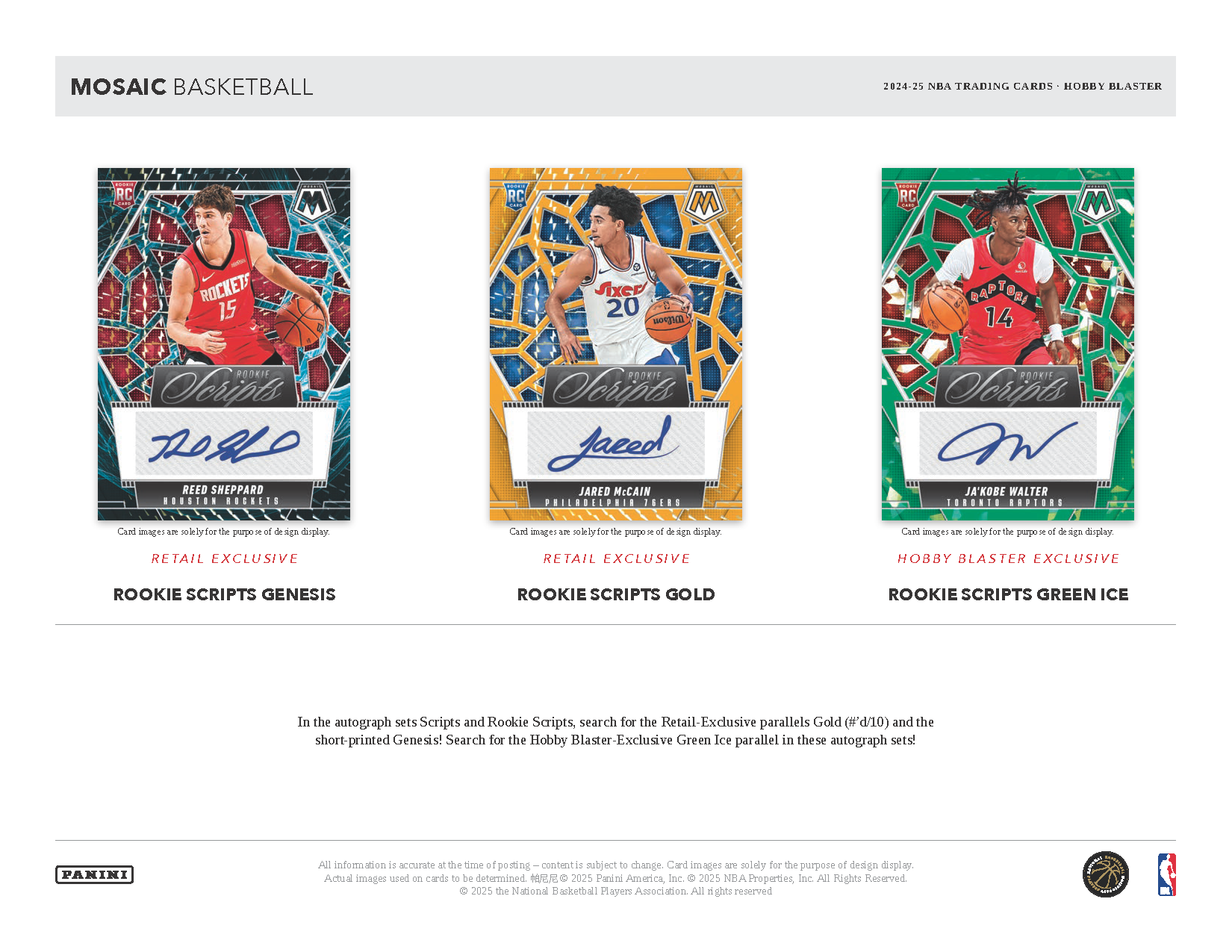 – In the autograph sets Scripts and Rookie Scripts, search for the Retail-Exclusive parallels Gold (#’d/10) and the short-printed Genesis! Search for the Hobby Blaster-Exclusive Green Ice parallel in these autograph sets!