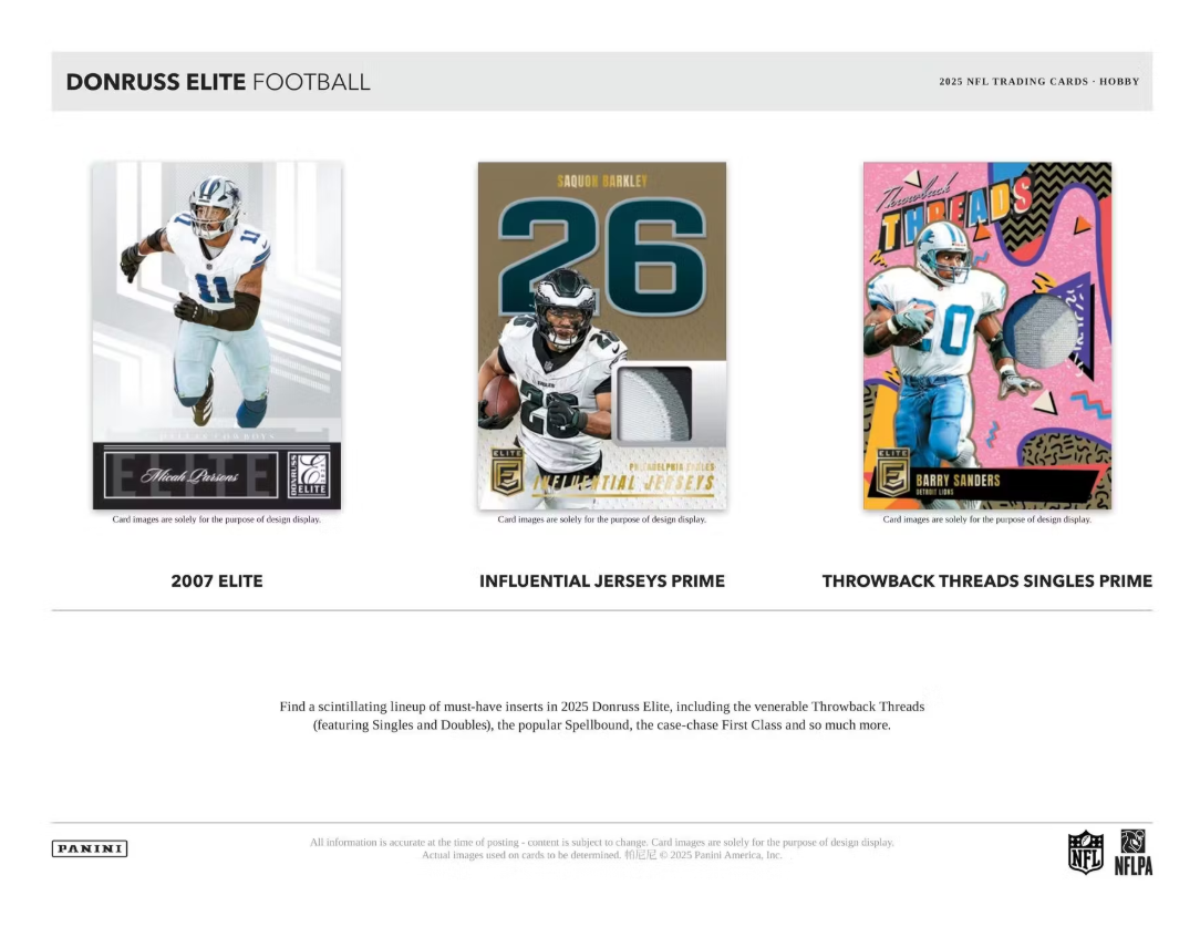 The fabled Donruss Elite Football franchise returns for the 2025 NFL season locked and loaded with a 200-card base set, featuring a captivating base aesthetic and 100 Rookie Cards!