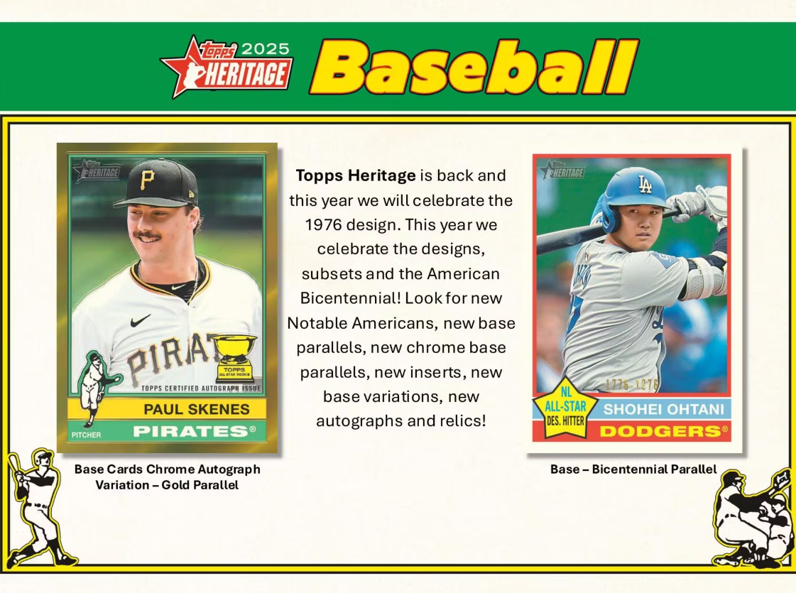 Topps Heritage is back and this year we will celebrate the 1976 design. This year we celebrate the designs, subsets and the American Bicentennial! Look for new Notable Americans, new base parallels, new chrome base parallels, new inserts, new base variations, new autographs and relics!